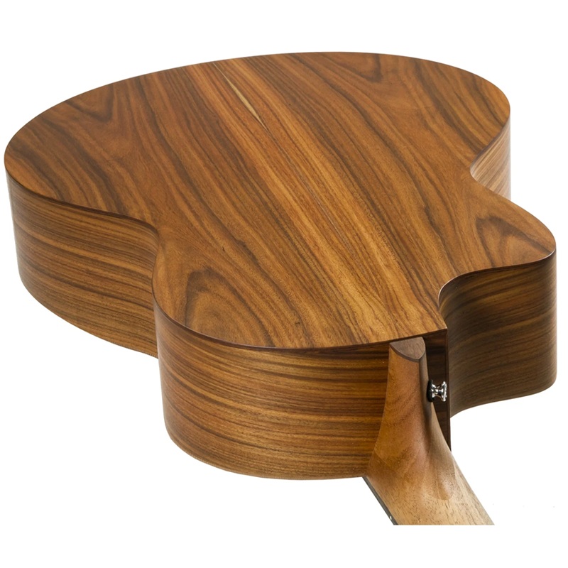 Phần lưng và hông sử dụng gỗ Santos Rosewood (Cẩm ấn Santos) 5 lớp chất lượng cao. Loại gỗ này không chỉ sở hữu những đường vân nâu đậm tuyệt đẹp, tạo nên vẻ ngoài quyền quý cho cây đàn, mà còn đóng vai trò quan trọng trong việc tăng cường độ ngân vang (sustain) và dải âm trung dày dặn. Cấu trúc lưng hông vững chắc giúp bảo vệ thùng đàn trước các tác động của môi trường và sự thay đổi nhiệt độ, đảm bảo cây đàn luôn duy trì được chất lượng âm thanh ổn định nhất qua nhiều năm tháng.