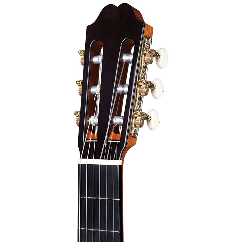 Khóa đàn cao cấp (thường là Gold Plated) đảm bảo độ chính xác khi lên dây và giữ cao độ ổn định. Cần đàn Mahogany với mặt phím Ebony (Gỗ Mun) cứng cáp, mang lại cảm giác chơi mượt mà và chính xác. Viền đàn (Binding) tinh tế, thường sử dụng vật liệu gỗ hoặc vật liệu cao cấp, tạo điểm nhấn nghệ thuật và bảo vệ cạnh đàn.