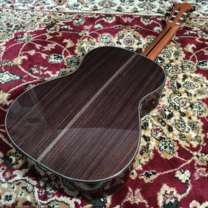 Mặt top Solid Spruce (Gỗ Thông Nguyên Khối) mang lại âm thanh sáng, có độ phóng (projection) mạnh mẽ và độ rõ ràng cao, hoàn hảo cho kỹ thuật ngón cần sự tách bạch. Lưng và hông Solid Rosewood (Hồng Mộc Nguyên Khối) tạo âm trầm sâu, âm bội phong phú và độ ngân tuyệt vời. Dáng classic truyền thống (non-cutaway) tối đa hóa sự cộng hưởng của thân đàn. Bridge (Ngựa đàn) Rosewood với xương đàn Bone đảm bảo truyền tải rung động tối ưu. Thiết kế Rosette (vòng trang trí) tinh xảo, thủ công, nhấn mạnh vẻ đẹp cổ điển và đẳng cấp.