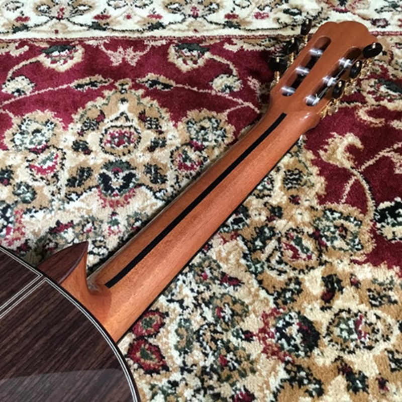 Khóa đàn cao cấp (thường là Gold Plated) đảm bảo độ chính xác khi lên dây và giữ cao độ ổn định. Cần đàn Mahogany với mặt phím Ebony (Gỗ Mun) mượt mà, hỗ trợ tối đa cho các kỹ thuật ngón phức tạp. Thiết kế headstock classic (Solid Headstock) mang phong cách cổ điển, sang trọng. Viền đàn (Binding) tinh tế, thường làm bằng gỗ hoặc chất liệu cao cấp, tạo điểm nhấn nghệ thuật và bảo vệ các cạnh đàn.