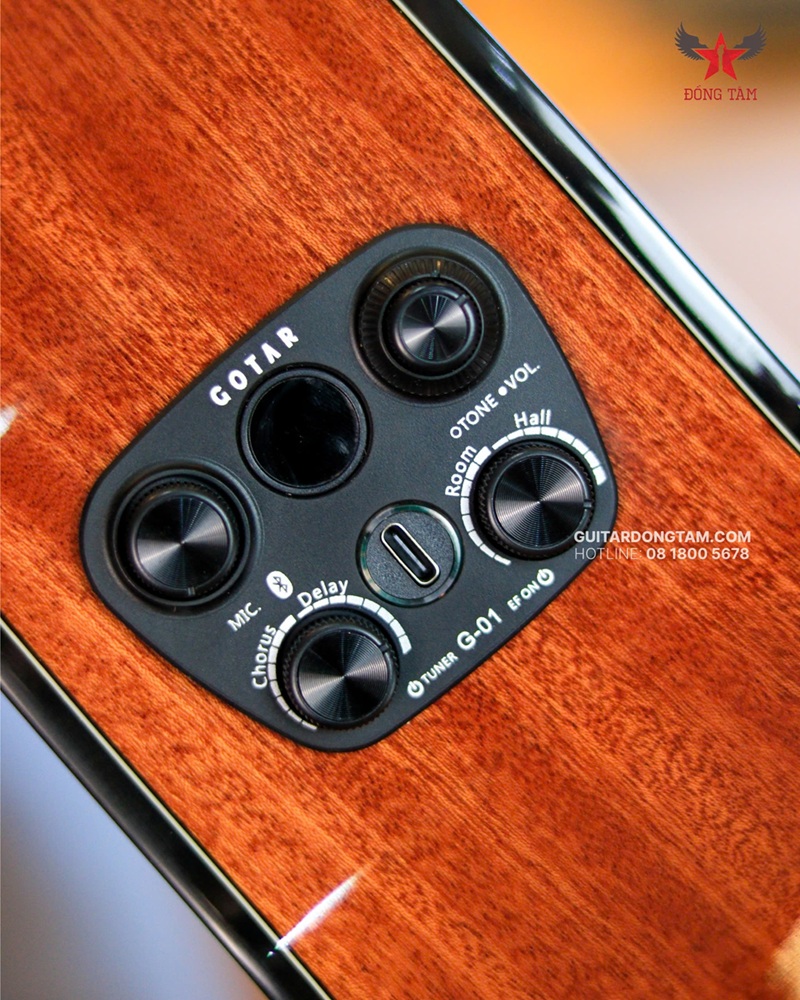 Mặt trước của Gotar Sunny CE được chế tác từ gỗ tuyết tùng đỏ nguyên tấm (solid cedar), loại gỗ quý nổi tiếng với âm thanh trầm ấm, mượt mà, và giàu cảm xúc, lý tưởng cho nhạc cổ điển và fingerstyle. Lớp sơn bóng cao cấp không chỉ bảo vệ bề mặt mà còn làm nổi bật vân gỗ tự nhiên, mang lại vẻ đẹp sang trọng. Hệ thống EQ Gotar Custom với màn hình LED và nút điều chỉnh (volume, bass, treble, phase) được bố trí tinh tế, hỗ trợ kết nối Bluetooth và loa 10W tích hợp, giúp Anh/Chị dễ dàng biểu diễn mà không cần ampli cồng kềnh. Rosette khảm tinh xảo và phần cứng mạ chống gỉ tạo điểm nhấn thẩm mỹ.