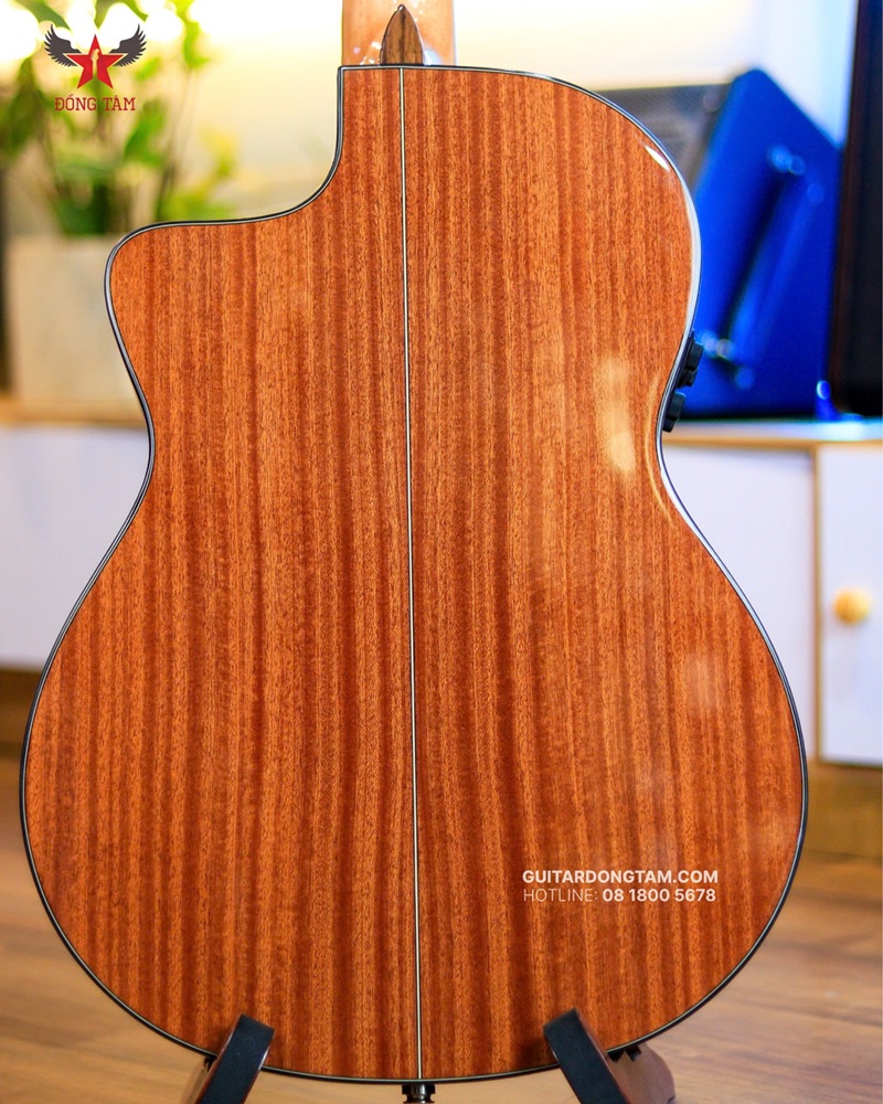 Thân đàn của Gotar Sunny CE sử dụng gỗ mahogany cho lưng và hông, mang lại âm thanh trung ấm, bass sâu, và treble rõ nét, phù hợp cho nhiều thể loại từ cổ điển đến pop acoustic. Dáng khuyết (cutaway) hiện đại giúp tiếp cận các phím cao dễ dàng, lý tưởng cho solo và fingerstyle. Thân đàn được hoàn thiện với sơn bóng chống ẩm, phù hợp khí hậu Việt Nam, đảm bảo độ bền lâu dài. Trọng lượng nhẹ 1.8 kg và thiết kế ôm tay mang lại sự thoải mái khi chơi lâu, phù hợp cho biểu diễn sân khấu hoặc luyện tập cá nhân.