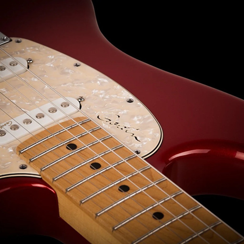 Mặt trước của Godin Session LTD là điểm nhấn nổi bật nhất, với thiết kế thân đặc (Solid Body) cổ điển (S-Style), được chế tác tinh tế từ gỗ Rock Maple/Basswood chất lượng cao. Cấu trúc thân đặc này đảm bảo độ ngân (sustain) và độ tấn công (attack) của cây đàn, tạo ra chất âm gọn gàng, punchy. Lớp hoàn thiện High Gloss (HG) màu Desert Red thủ công là một tác phẩm nghệ thuật, với màu đỏ đậm có chiều sâu và sự quyến rũ, mang lại vẻ ngoài nổi bật và sang trọng. Đường cắt vát đôi sâu (Double Cutaway) là một chi tiết truyền thống, đảm bảo sự thoải mái và dễ dàng khi người chơi thực hiện các đoạn solo ở các phím cuối, phù hợp cho cả biểu diễn đứng và ngồi.