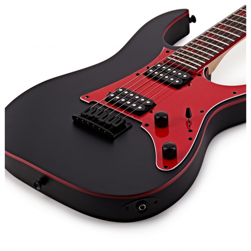 Ngoại hình của Đàn Guitar Điện Ibanez GRG131DX HH gây ấn tượng mạnh mẽ với sự tương phản tuyệt đối giữa màu sơn Black Flat và các chi tiết như viền đỏ trên Pickguard hay Logo Ibanez đỏ trên đầu đàn. Sự kết hợp này trên Đàn Guitar Điện Ibanez GRG131DX HH không chỉ mang lại vẻ đẹp lộng lẫy dưới ánh đèn sân khấu mà còn thể hiện sự tỉ mỉ trong việc trang bị phần cứng màu đen mạnh mẽ, tạo nên một nhạc cụ có sức hút mãnh liệt và đầy cảm hứng.