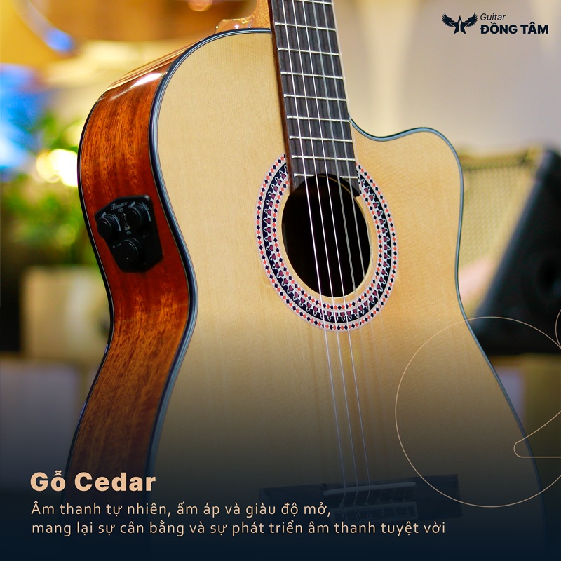 Mặt top đàn được làm từ gỗ Cedar, một loại gỗ bổ trợ rất tốt cho việc đầu ra âm thanh sẽ ấm áp, tình cảm phù hợp với những cây đàn Classic. Lưng hông được làm từ gỗ Mahogany, một loại gỗ thường được sử dụng để tạo ra những cây đàn chất lượng. Đầu đàn được in logo Flamenco cách điệu để thể hiện được chất lượng của thương hiệu đến từ Tây Ban Nha này, ngoài ra bộ khóa chính hãng của cây đàn cũng là một điểm cộng rất lớn vì đem lại cảm giác êm tay, nhẹ nhàng mỗi khi điều chỉnh dây đàn.