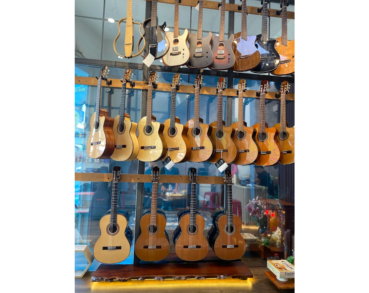 Câu trả lời là: tùy từng cửa hàng. Nhiều shop nhỏ chỉ có vài mẫu guitar entry-level, ít lựa chọn về thương hiệu và phân khúc. Một số shop mua đàn theo lô giá rẻ, không có đàn gỗ solid – dòng được người chơi đánh giá cao.