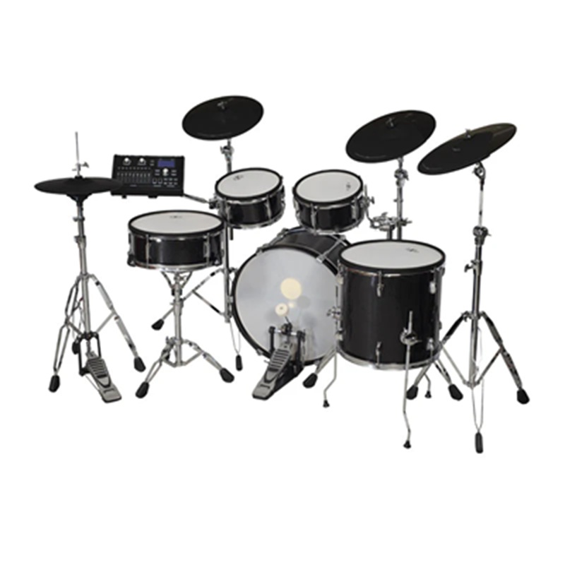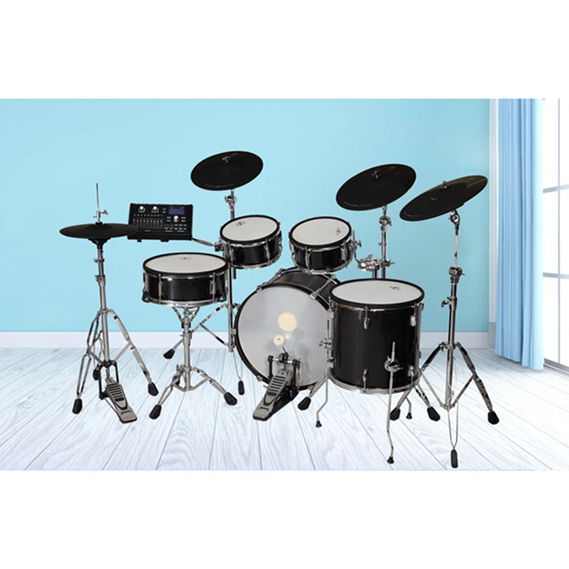 Bộ trống đi kèm stand hi-hat, pedal kick, ghế drummer, dùi trống, dễ lắp đặt. Viền mesh head với rim layered cho snare, tạo phản hồi tự nhiên, kết hợp cymbal full rubber cho độ bền cao. Snare, toms, kick tương thích với Roland, Alesis, ATV, Unlock, Lemon Drums cho nâng cấp.