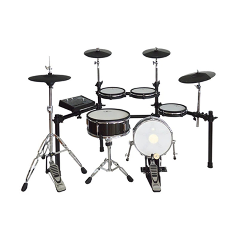 Bộ trống đi kèm stand hi-hat, pedal kick, ghế drummer, dùi trống, dễ lắp đặt. Viền mesh head với rim layered cho snare, tạo phản hồi tự nhiên, kết hợp cymbal full rubber cho độ bền cao.